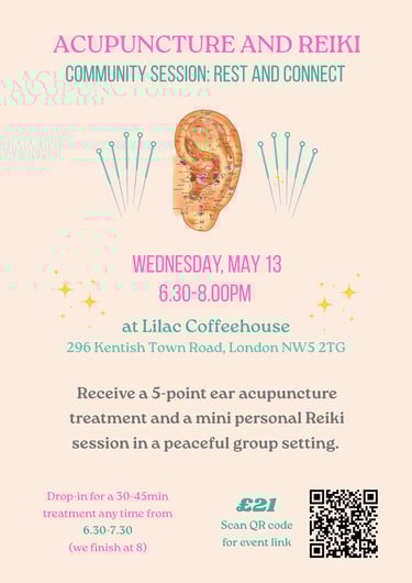 Join our monthly community clinic, where you’ll receive a gentle, relaxing, 5-point ear acupuncture treatment lasting 30-45 mins, and a personalised mini-Reiki session, in a peaceful group setting.